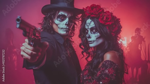 Mysterious Couple in Dramatic Lighting with Gun and Roses, Halloween or Theatrical Theme