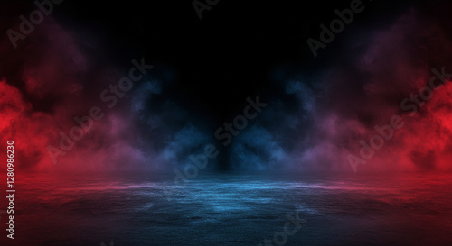 Mysterious dark background with red and blue neon fog reflection on wet floor. Empty night scene with glowing smoke and light. Modern futuristic backdrop for banner design with copy space