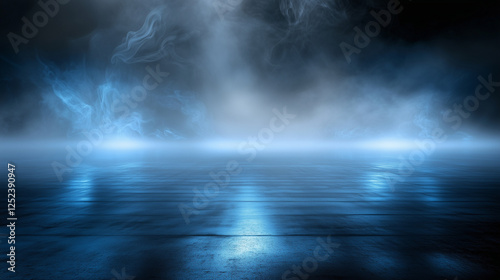 Mysterious dark blue foggy street at night with wet asphalt reflections and atmospheric mist. Empty urban road with moody lighting, perfect for product display, studio presentations, and text overlays