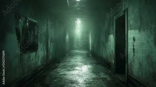 Mysterious Dark Hallway with Illuminating Ceiling Light Creating a Contrast of Shadows and Brightness Evoking a Sense of Intrigue and Enigma in an Abandoned Urban Setting