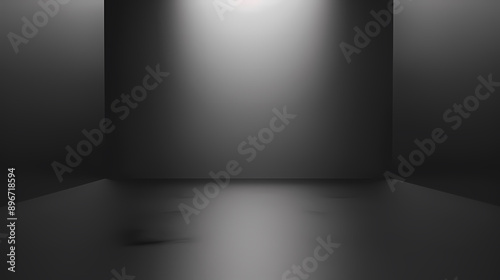 Mysterious dark room illuminated by a single spotlight, casting dramatic shadows on a reflective floor.