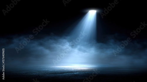 Mysterious dark scene illuminated by a focused spotlight shining through fog and smoke