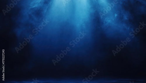 Mysterious deep blue fog illuminated by soft rays of light creating an eerie and calm atmosphere