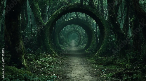 Mysterious dirt path winding through enchanted green forest with circular tree formations