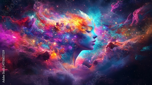 Mysterious female figure emerging from vibrant cosmic explosion in deep space