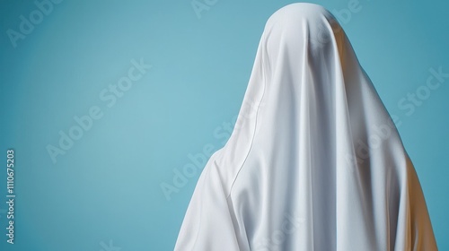 Mysterious Figure Draped in White Fabric Against Blue Background