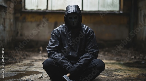 Mysterious Figure in Black Hoodie and Mask Sitting in an Abandoned Urban Setting with Rain
