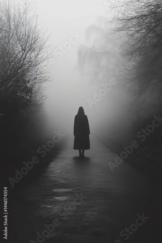 Mysterious figure in fog abandoned pathway black and white photography eerie atmosphere ground level isolation and intrigue