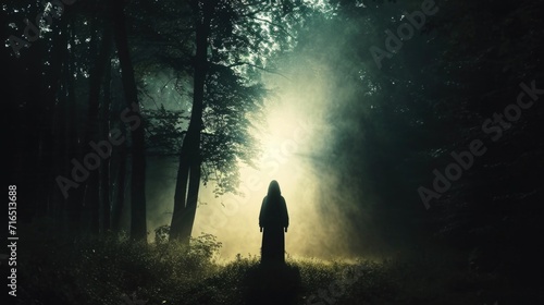 Mysterious Figure in Foggy Forest - Surreal Nature and Human Element