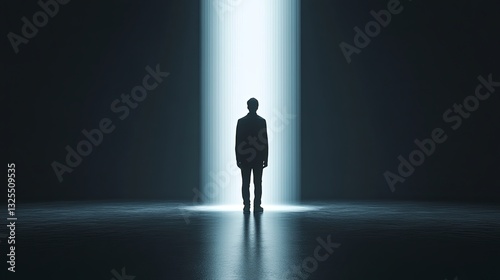 Mysterious figure stands in a spotlight in an empty dark space, creating an atmosphere of intrigue and contemplation