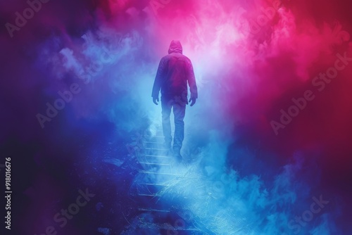 Mysterious Figure Walking Upstairs Through Colorful Fog at Night