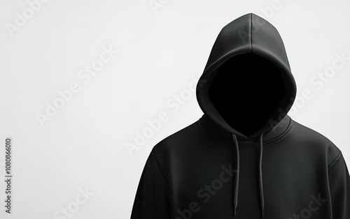 Mysterious figure wearing a black hoodie against a plain white background in a minimalist setting