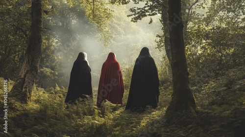 Mysterious Figures in Cloaks Walking Through a Foggy Forest