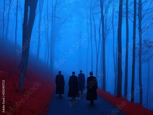 Mysterious Figures Walking Through a Foggy Blue Forest with Red Leaves Underneath