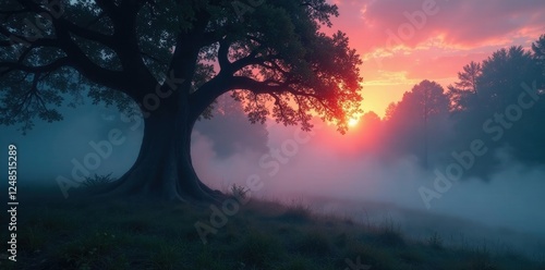 Mysterious fog clings to ancient tree trunks at dusk, branches, trees