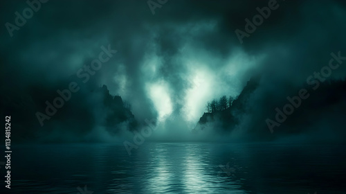 Mysterious foggy lake scene at night with dark mountains.