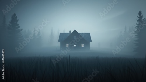 Mysterious foggy night scene with a solitary house in the woods, evoking eerie and suspenseful feelings of isolation and mystery.