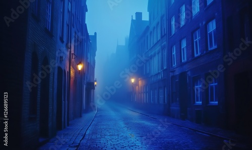 Mysterious foggy street illuminated by vintage lamps in a historic town