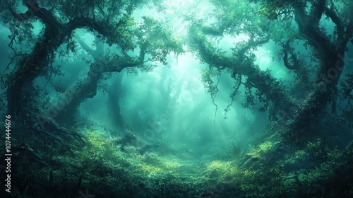 Mysterious forest background with ancient twisted trees, vines hanging low, and a subtle mist covering the ground