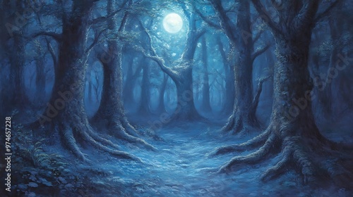 Mysterious Forest Path Illuminated by Moonlight with Shadows in a Blue Night