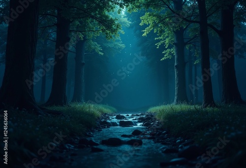 Mysterious Forest Stream Illuminated by Soft Moonlight at Twilight. Generative AI