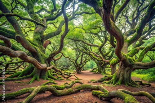 Mysterious forest with twisted tree trunks and gnarled branches, moss-covered rocks, eerie silence, overgrown vegetation, rugged terrain