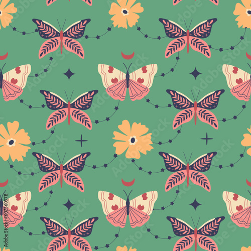 Mysterious garden, fairytale. Butterflies and retro flowers, stars, moons. Mystical symbols. Halloween. Bohemian floral seamless pattern, background.