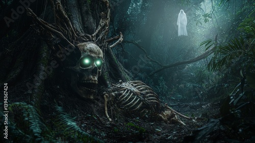 Mysterious half-decay in dense indian jungle haunting skeleton scene atmospheric environment eerie viewpoint