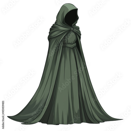 Mysterious hooded figure cloaked in flowing olive green garment, anonymity concept