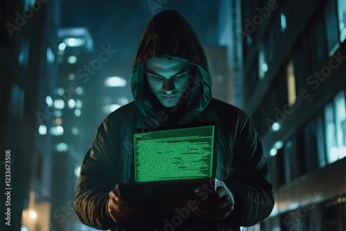 Mysterious hooded figure using laptop in urban night setting, illuminated by green code, creating an atmosphere of secrecy, technology, and data analysis in a cityscape.