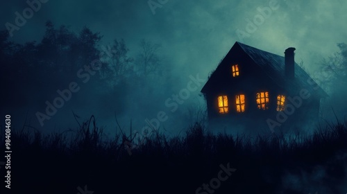 Mysterious House in a Foggy Forest at Night