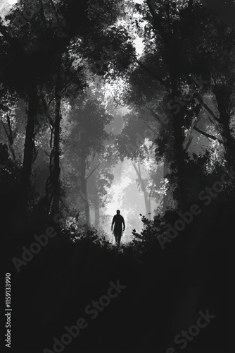 Mysterious Journey Through a Misty Forest Silhouette - Moody Nature Scene for Print or Poster