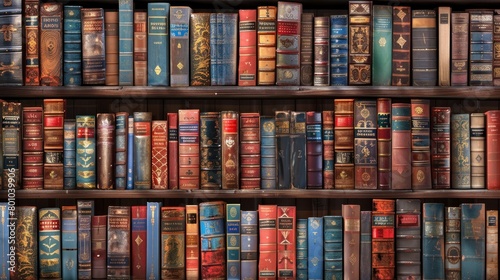 Mysterious Library Bookshelf background with many Antique Books arranged