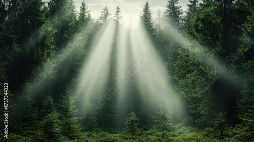 Mysterious light beams shining through dense pine forest, creating enchanting atmosphere