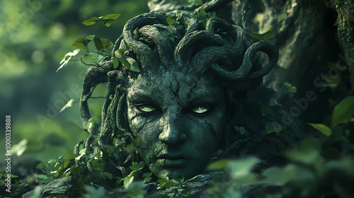 Mysterious medusa character in the forest. stone head. illustration. Medusa. Illustration