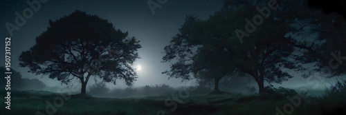 Mysterious Night Nature Scene with Moonlight, Mist, Stars, Forest Atmosphere, Cinematic Mood, Realistic Landscape Art