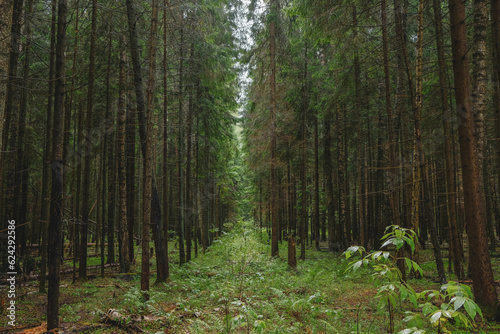 Mysterious overgrown road clearing in a dense spruce forest.