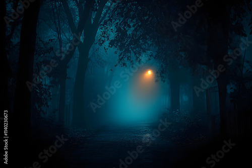 Mysterious pathway through the dark foggy forest in cold tones. Halloween background.