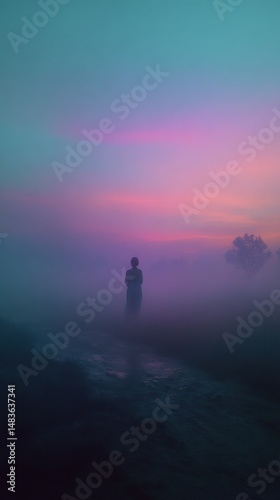 Mysterious silhouette figure standing alone in a foggy landscape at dusk with vibrant colors in the sky and soft, ethereal atmosphere of nature