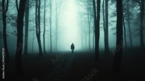 Mysterious Silhouette of a Person Walking Through a Foggy Forest with Tall Trees