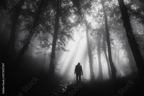 mysterious silhouette of man walking in foggy forest at night scary dark landscape