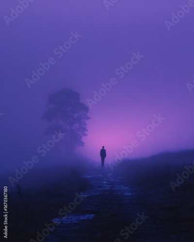 Mysterious Silhouette Walking Towards Purple Sunset in Fog