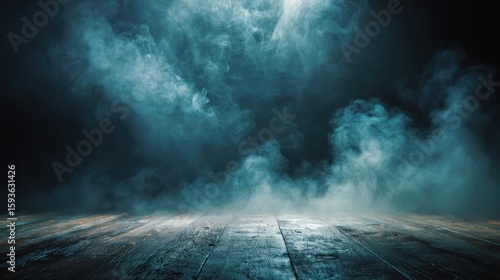 Mysterious Stage with Wooden Floor and Dense Fog Perfect for Dramatic Presentations