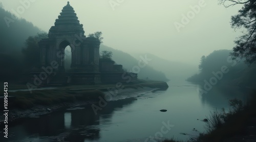 Mysterious temple amidst foggy landscape