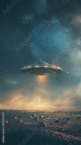 Mysterious UFO Hovering over a Plain Background. Futuristic Sci-Fi concept