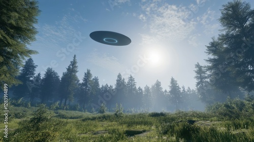 Mysterious ufo hovering over forest clearing on bright sunny day