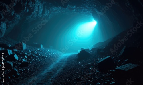 Mysterious underground cave with eerie blue light beaming through darkness