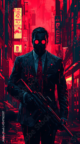 Mysterious Urban Detective in Dark Suit: A Striking Digital Art Character with Ominous Glowing Eyes, Futuristic Atmosphere, and Neon City Lights in a Crime Thriller Narrative