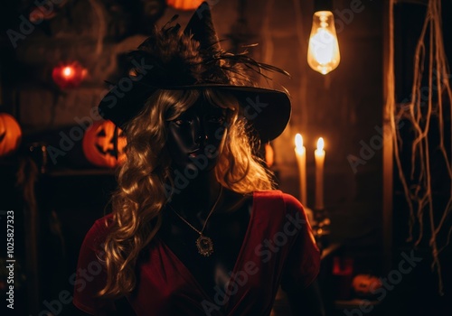 Mysterious witch in Halloween setting with candlelight pumpkins