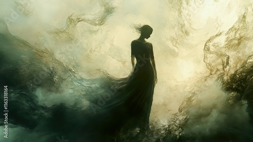 Mysterious Woman in Flowing Dress: A Surreal Digital Painting